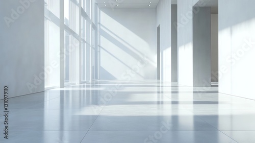 Obraz premium Sunlit modern gallery interior, empty space, floor reflections, architectural...