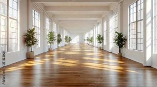 © @Luthfi, Obraz premium Sunlit Modern Hallway Interior Design: Spacious, Bright Loft with Hardwood Floors and Plants