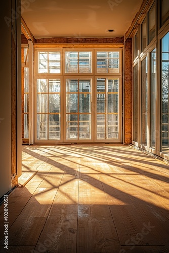 © Sunshine, Obraz premium Sunlit Modern Interior with Large Windows and Wooden Flooring in a Cozy Room