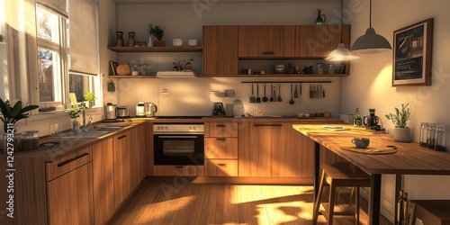 Fototapeta premium Sunlit Modern Kitchen With Wooden Cabinets And Island