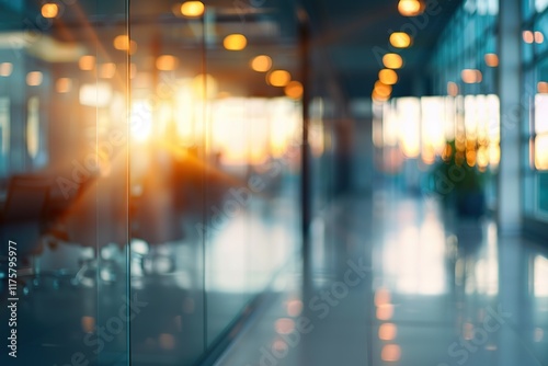 Fototapeta premium Sunlit modern office hallway with glass walls and blurred interior.