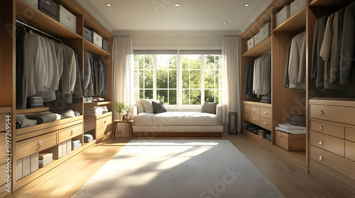 © Siasart, Fototapeta premium Sunlit Modern Walk-in Closet 3D Render