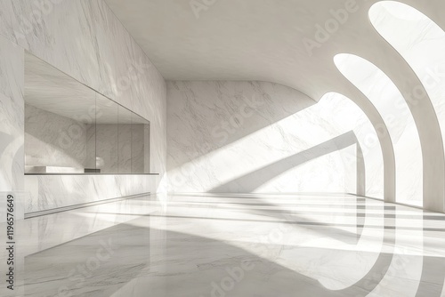 © idharmaian, Obraz premium Sunlit modern white marble interior with arched windows and reflective floor.