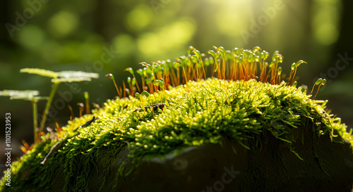 © StockWorld, Naklejka premium Sunlit Moss and Sprouting Plants on Forest Rock - Vibrant Nature Photography