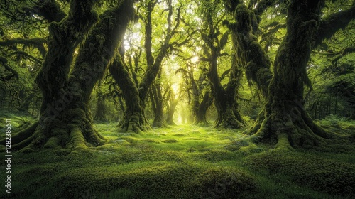 © harryaishi, Obraz premium Sunlit mossy forest path.