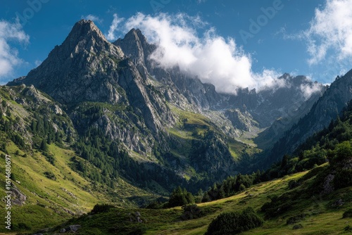 Fototapeta premium Sunlit mountain valley, green slopes, rocky peaks, partly cloudy sky