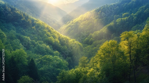 Fototapeta premium Sunlit mountain valley, lush green forest, misty sunrise, nature tranquility,...