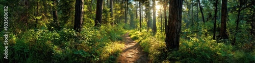 © Serhii, Obraz premium Sunlit Nature Trail Through a Lush Forest Landscape with Vibrant Green Trees