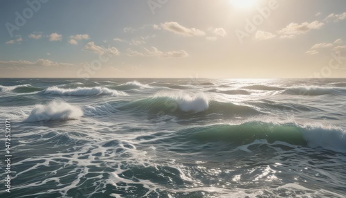 Fototapeta premium Sunlit ocean surface with dynamic whitecaps and rolling waves , foam, surf, day