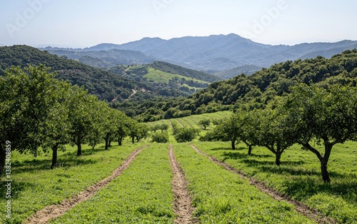 © creatfive, Fototapeta premium Sunlit Orchard Slopes Towards Distant Mountains