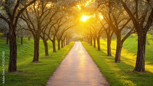 © arda, Naklejka premium Sunlit park pathway through trees at golden hour