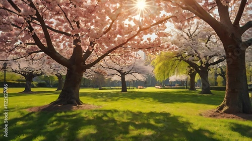 © Ronald, Obraz premium Sunlit Park with Blossoming Cherry Trees in Spring