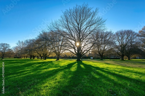 Obraz premium Sunlit park with trees casting shadows