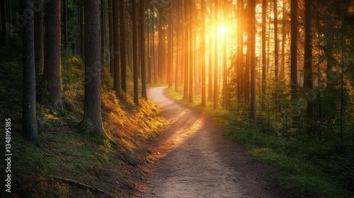 © acilll, Naklejka premium Sunlit Path in a Mystical Forest: Golden Hour Serenity