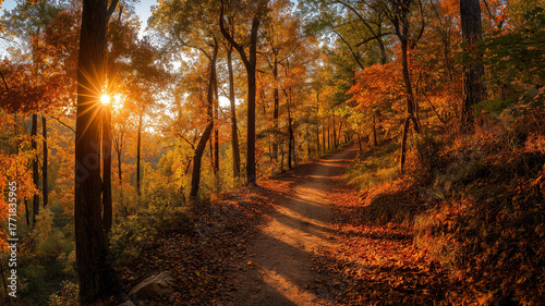 © SHALENA, Obraz premium Sunlit path in a park before sunset