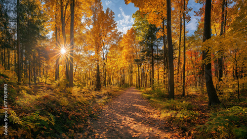 © SHALENA, Obraz premium Sunlit path in a park before sunset