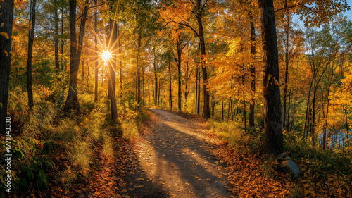 © SHALENA, Obraz premium Sunlit path in a park before sunset