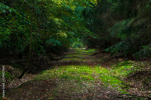 Obraz premium sunlit path in the dark forest