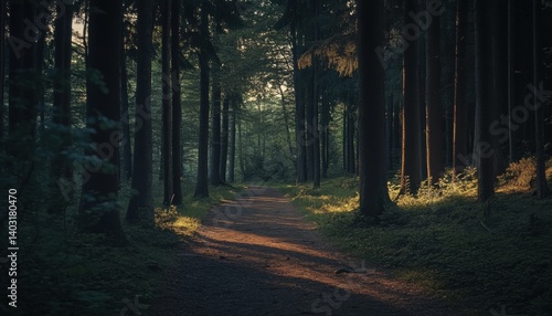 © yusilva, Obraz premium Sunlit path meandering through a dense forest.