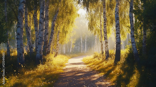 Obraz premium Sunlit path through a birch forest.