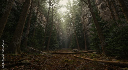 Obraz premium Sunlit Path Through a Dark Forest