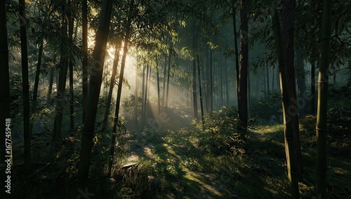 © Apel, Obraz premium Sunlit path through a dense bamboo forest