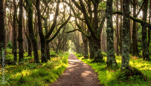 © pzyta, Obraz premium Sunlit path through a dense forest (1)