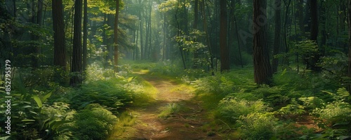 © peppastocker, Naklejka premium Sunlit path through a dense forest