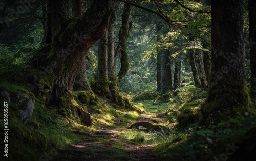 © afdal, Naklejka premium Sunlit path through a dense, mossy forest