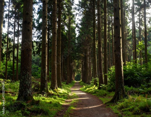 Obraz premium Sunlit path through a dense pine forest