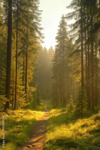 Obraz premium Sunlit Path Through a Forest of Tall Trees