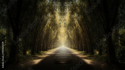 © Infinity, Obraz premium Sunlit Path Through a Forest of Trees