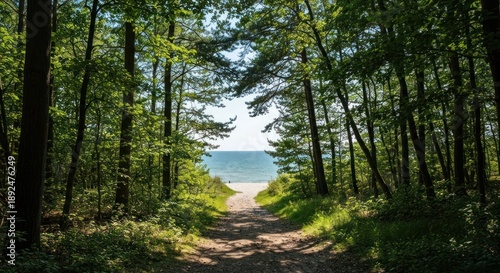 © ROY, Obraz premium Sunlit path through a forest opens to a bright beach and ocean