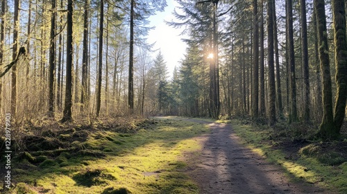 © BerkahStock, Fototapeta premium Sunlit path through a lush evergreen forest. (1)
