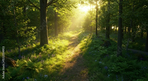 © Adobe, Obraz premium Sunlit path through a lush forest