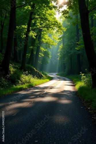 © vattana, Obraz premium Sunlit Path Through a Lush Green Canopy of Trees on a Winding Road