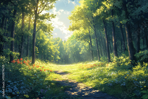 Obraz premium Sunlit Path Through A Lush Green Forest
