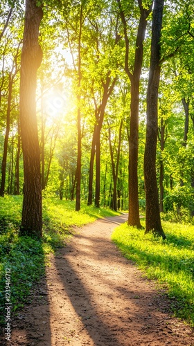 © Adobe, Fototapeta premium Sunlit Path Through a Lush Green Forest