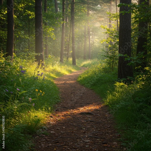 Obraz premium Sunlit Path Through a Lush Green Forest