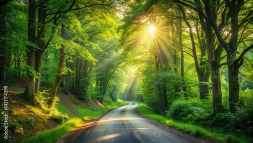 Fototapeta premium Sunlit Path Through a Lush Green Forest Canopy with Rays of Sunlight Illuminating the Winding Road