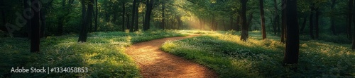 © Alexey, Obraz premium Sunlit Path Through a Lush Green Forest. Generative AI