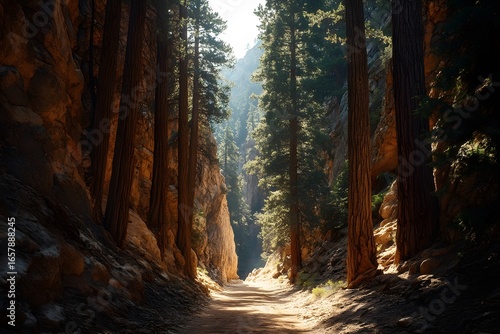 © Muhammad, Obraz premium Sunlit Path Through a Majestic Pine Forest