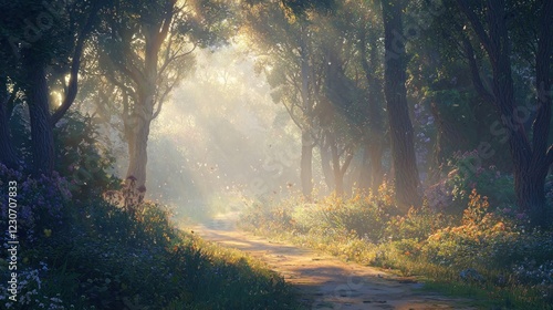 © Ikhsan, Obraz premium Sunlit path through a misty, floral forest.