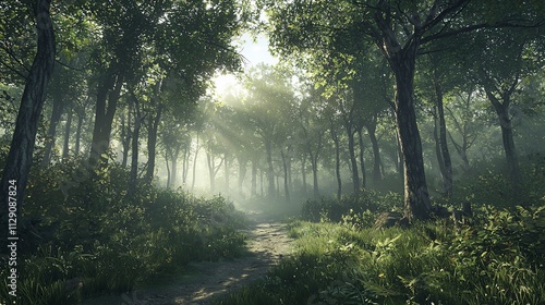 © ABIDZAR ALFAREZ, Fototapeta premium Sunlit path through a misty forest.