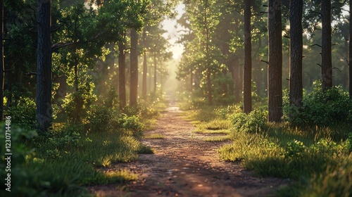© Ikhsan, Obraz premium Sunlit path through a misty forest.