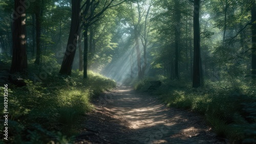 © nawang, Fototapeta premium Sunlit path through a misty forest (2)