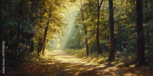 © Ali, Obraz premium Sunlit path through a misty forest.
