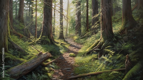 © Ardhana, Obraz premium Sunlit Path Through a Mossy Old Growth Forest