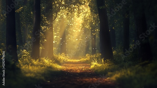 © Arc std., Naklejka premium Sunlit path through a mystical forest.