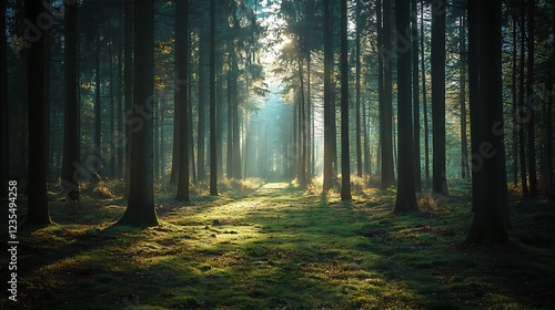 © GulirBawah, Obraz premium Sunlit Path Through A Mystical Forest Of Tall Trees